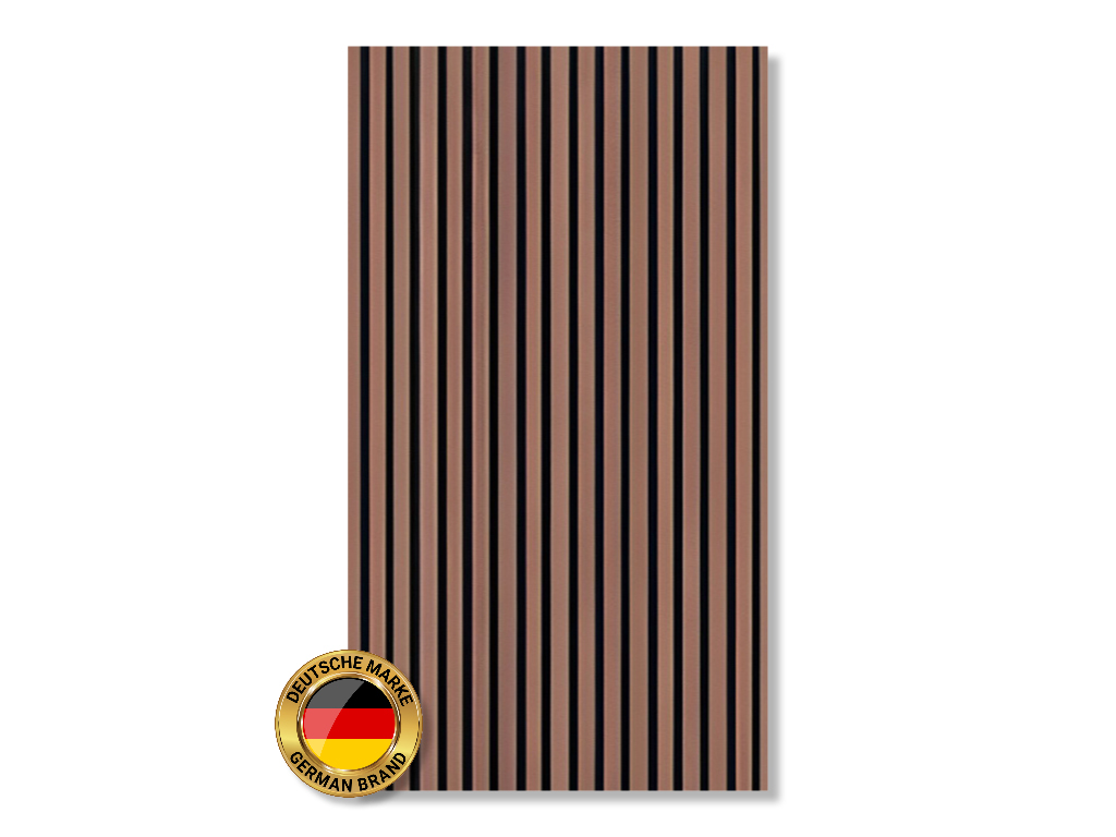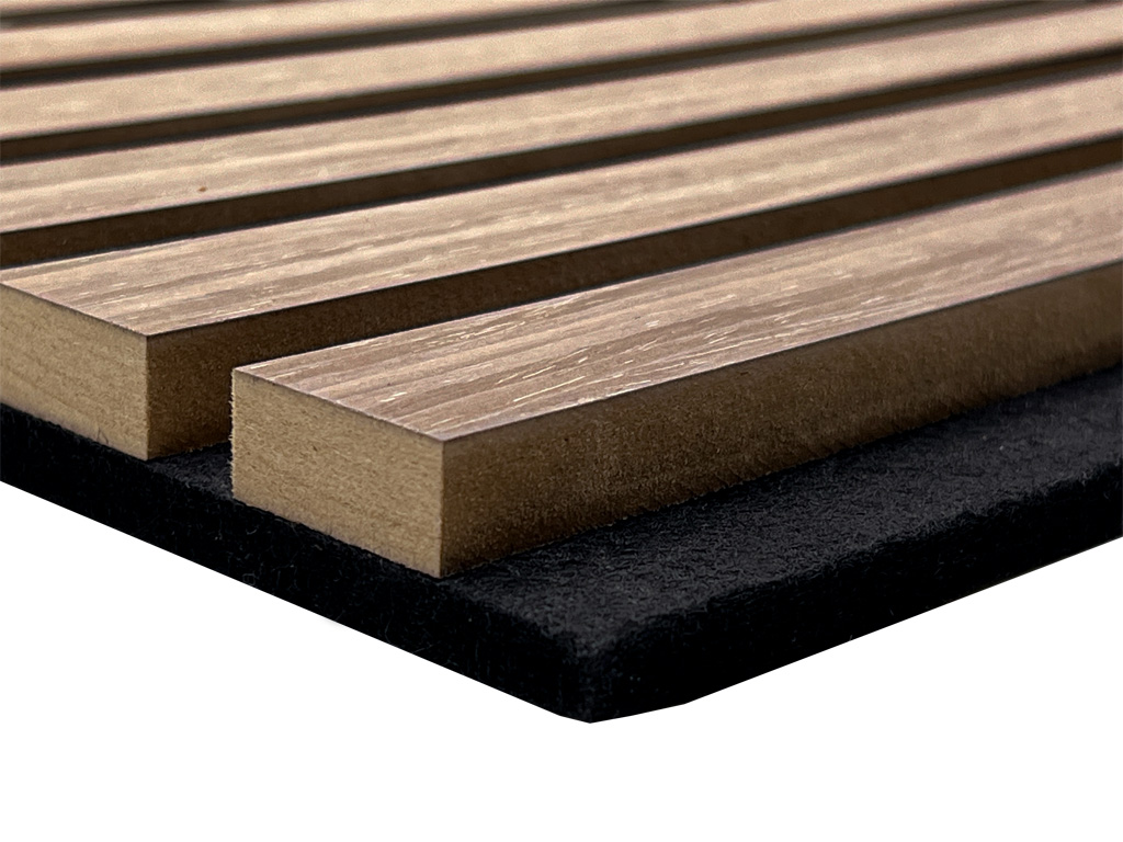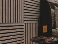Akustikpaneele dienen der Gestaltung von Wänden und Decken. Zusätzlich stehen die akustischen Eigenschaften der Produkte im Vordergrund. Die Paneele haben eine schwarze Trägerplatte aus recyceltem, schallabsorbierenden Polyester, auf denen Lamellen (MDF) angebracht sind, die mit astfreier Eiche furniert sind.