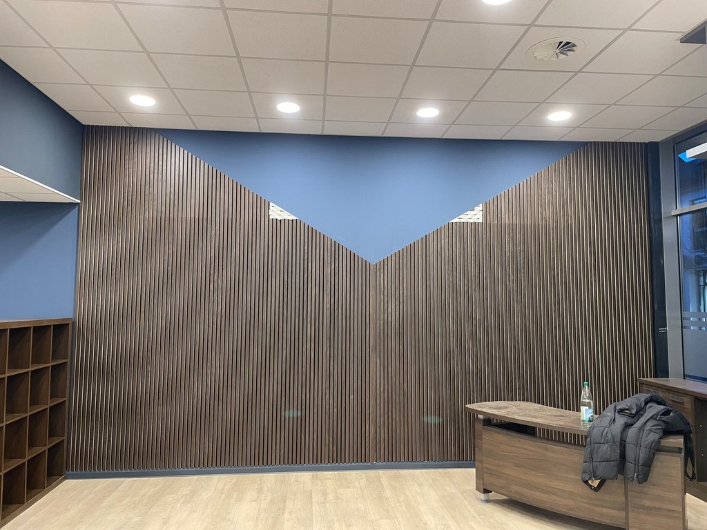 Akustikpaneele dienen der Gestaltung von Wänden und Decken. Zusätzlich stehen die akustischen Eigenschaften der Produkte im Vordergrund. Die Paneele haben eine schwarze Trägerplatte aus recyceltem, schallabsorbierenden Polyester, auf denen Lamellen (MDF) angebracht sind, die mit astfreier Eiche furniert sind.