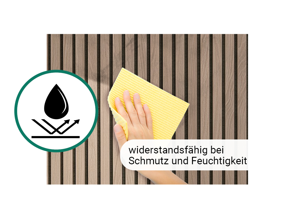 Die Akustikpaneele dienen der Gestaltung von Wänden und Decken. Zusätzlich stehen die akustischen Eigenschaften der Produkte im Vordergrund. Die Paneele haben eine Trägerplatte aus schallabsorbierendem, schwarzem Filz (vegan) mit einem hohen Recyclinganteil von 70%, auf denen Lamellen (MDF) angebracht sind.