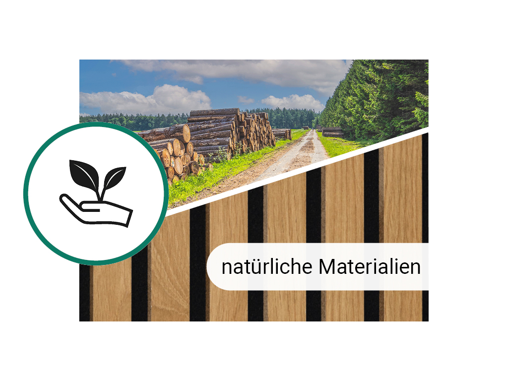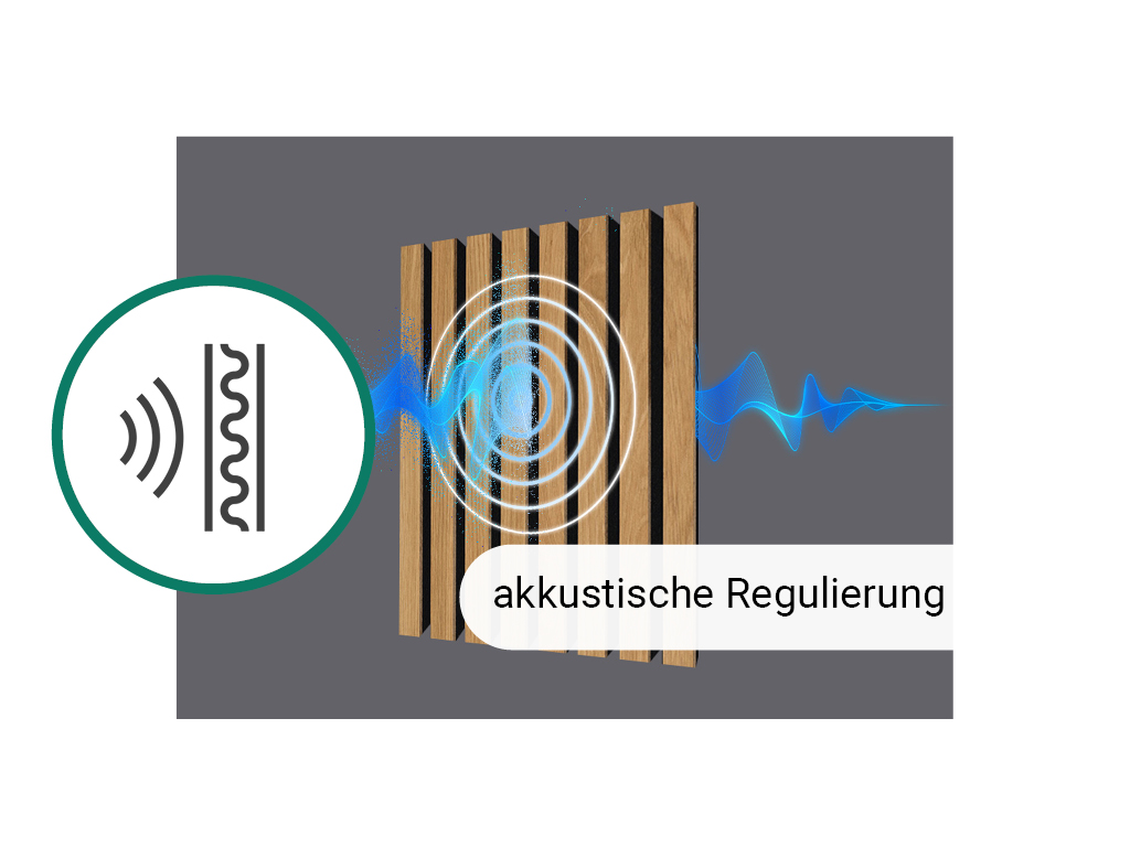 Akustikpaneele dienen der Gestaltung von Wänden und Decken. Zusätzlich stehen die akustischen Eigenschaften der Produkte im Vordergrund. Die Paneele haben eine Trägerplatte aus schallabsorbierendem schwarzem Filz (vegan) mit einem hohen Recyclinganteil von 70%, auf dem Lamellen (MDF) angebracht sind.