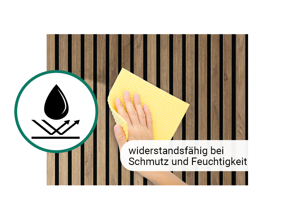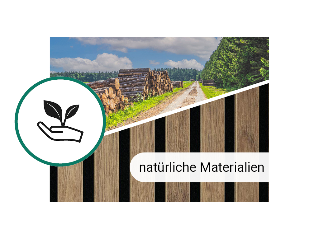 Die Akustikpaneele dienen der Gestaltung von Wänden und Decken. Zusätzlich stehen die akustischen Eigenschaften der Produkte im Vordergrund. Die Paneele haben eine Trägerplatte aus schallabsorbierendem, schwarzem Filz (vegan) mit einem hohen Recyclinganteil von 70%, auf denen Lamellen (MDF) angebracht sind.
