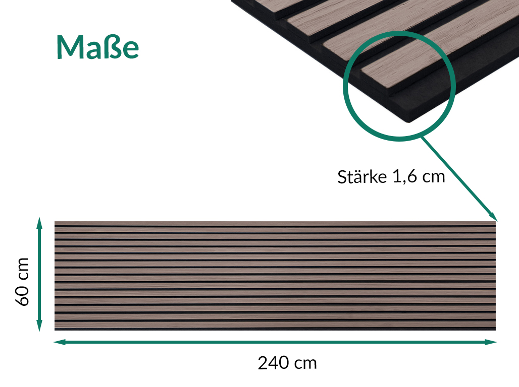 Lieferumfang: | 1 x Akustikpaneele 240 x 60 cm (entspricht 1,44 qm) |