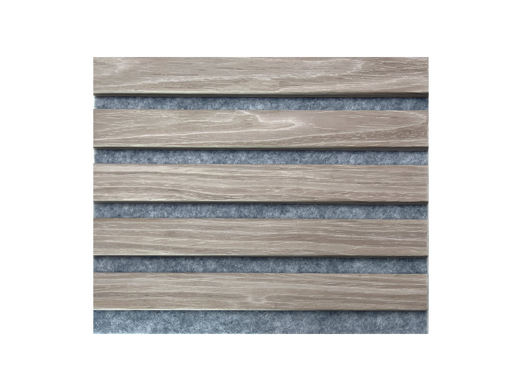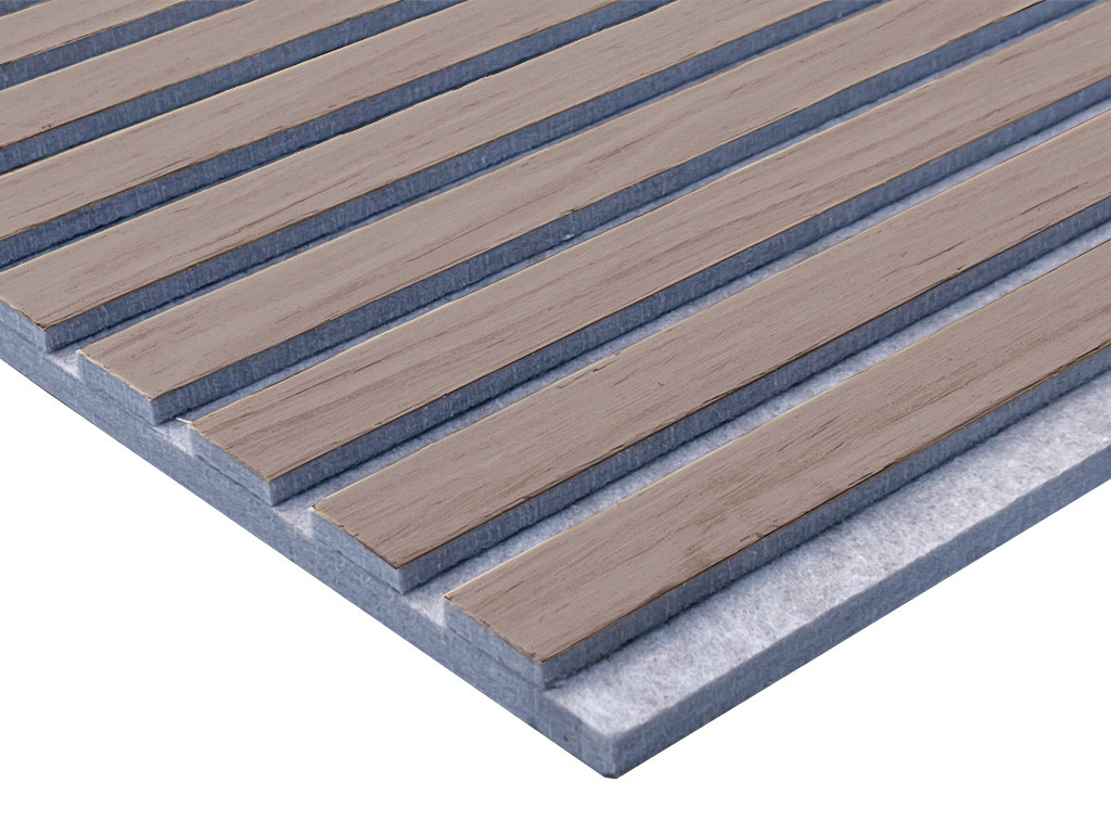 Die Paneele bestehen aus einer einseitig furnierten Trägerplatte aus schwarzem Filz, auf der 6 mm starke Filz-Lamellen angebracht sind. Diese besondere Struktur ermöglicht eine optimale akustische Regulierung und Nachhalldämpfung.