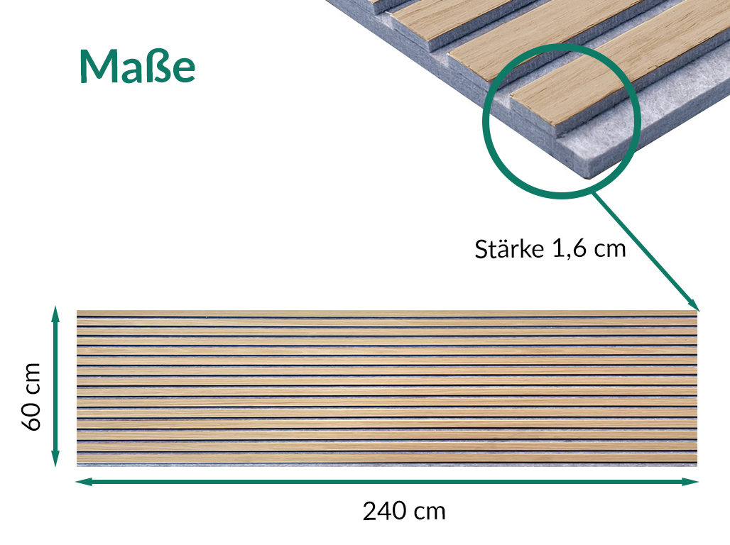 Lieferumfang: | 1 x Akustikpaneele 240 x 60 cm (entspricht 1,44 qm) |