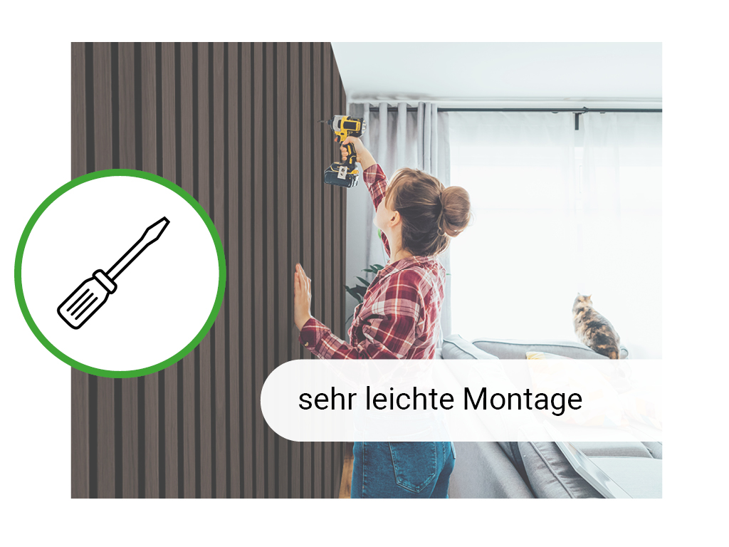 Die Akustikpaneele werden als ganze Platten geliefert, was die Installation denkbar einfach macht – sie können im Handumdrehen an Wänden oder Zimmerdecken montiert werden. Lege zunächst fest, in welcher Ausrichtung du die Paneele anbringen möchtest und kürze sie bei Bedarf passend. Anschließend an die Wand schrauben oder kleben – fertig!