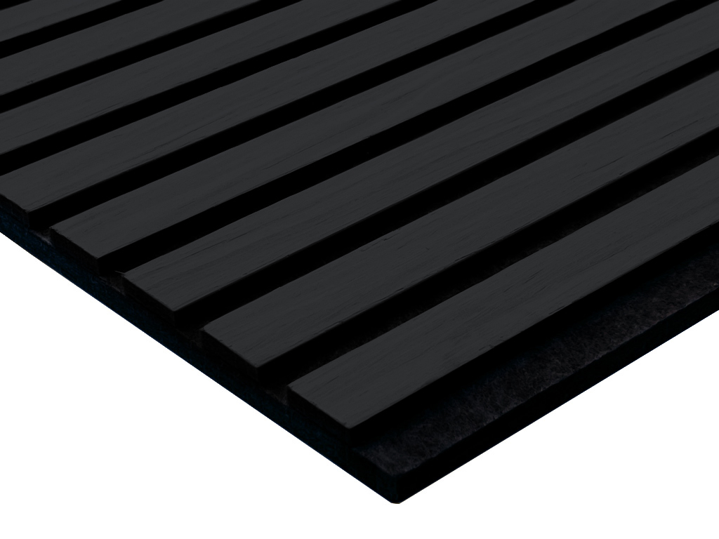 Die Paneele bestehen aus einer dreiseitig furnierten Trägerplatte aus schwarzem Filz, auf der 9 mm starke Filz-Lamellen angebracht sind. Diese besondere Struktur ermöglicht eine optimale akustische Regulierung und Nachhalldämpfung.