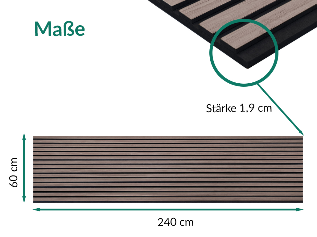 Lieferumfang: | 1 x Akustikpaneele 240 x 60 cm (entspricht 1,44 qm) |