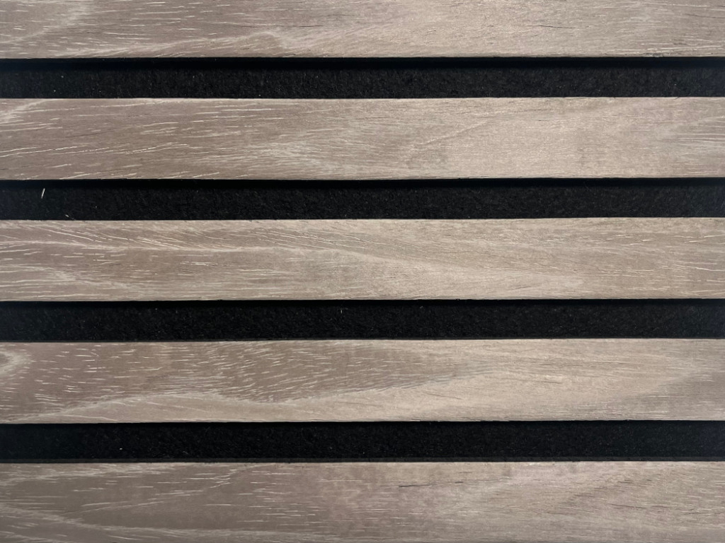 Die Paneele bestehen aus einer dreiseitig furnierten Trägerplatte aus schwarzem Filz, auf der 9 mm starke Filz-Lamellen angebracht sind. Diese besondere Struktur ermöglicht eine optimale akustische Regulierung und Nachhalldämpfung.