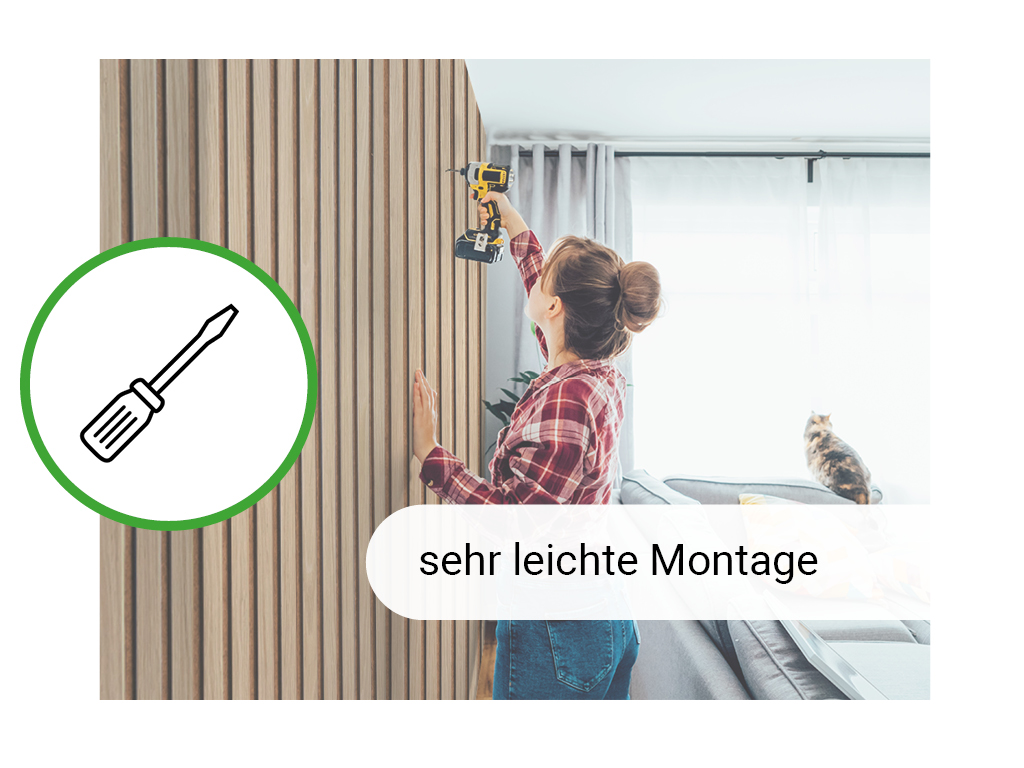 Die Akustikpaneele werden als ganze Platten geliefert, was die Installation denkbar einfach macht – sie können im Handumdrehen an Wänden oder Zimmerdecken montiert werden. Lege zunächst fest, in welcher Ausrichtung du die Paneele anbringen möchtest und kürze sie bei Bedarf passend. Anschließend an die Wand schrauben oder kleben – fertig!