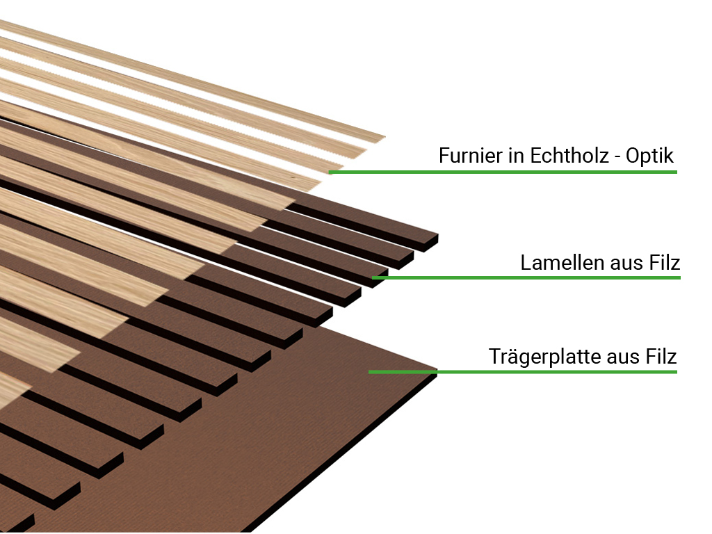 Die Paneele bestehen aus einer dreiseitig furnierten Trägerplatte aus schwarzem Filz, auf der 9 mm starke Filz-Lamellen angebracht sind. Diese besondere Struktur ermöglicht eine optimale akustische Regulierung und Nachhalldämpfung.