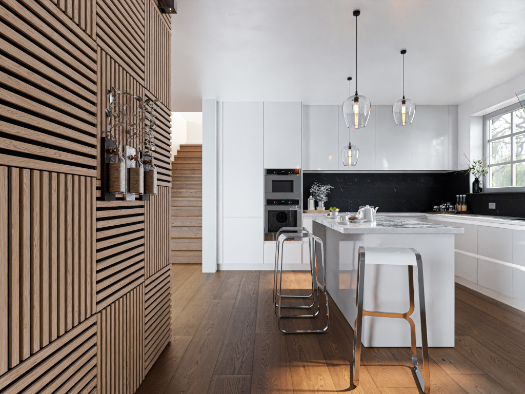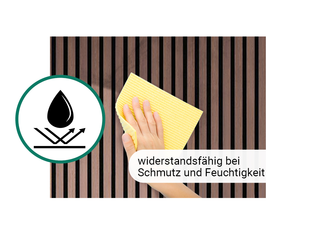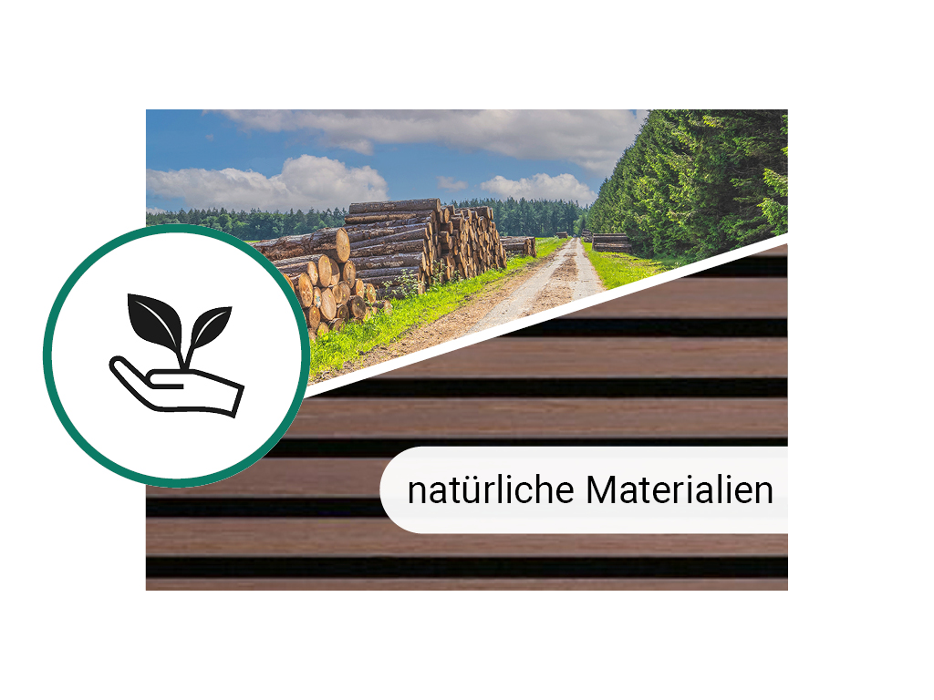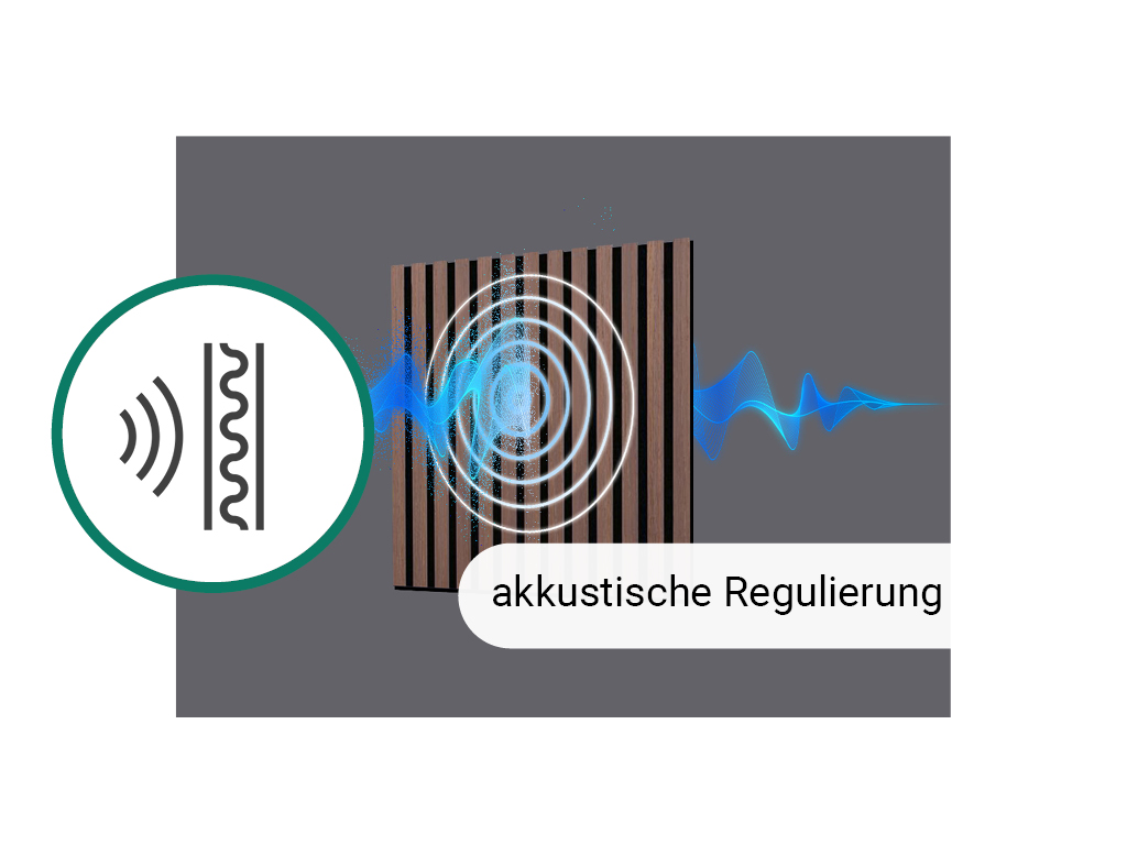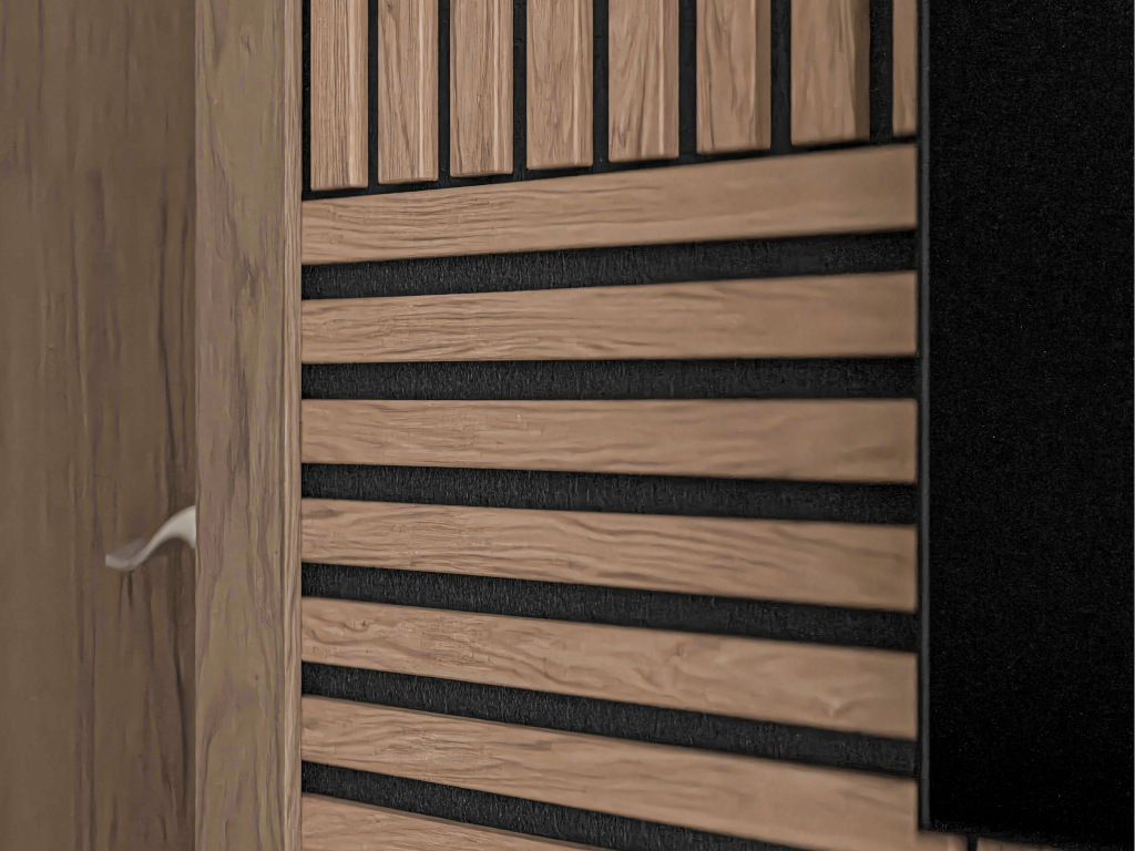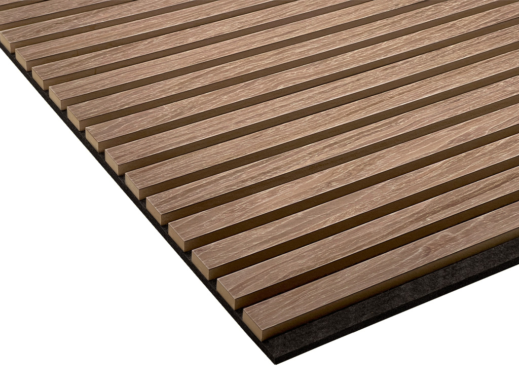 Die Paneele bestehen aus einer Trägerplatte, auf der Lamellen aus Holz angebracht sind. Diese besondere Struktur ermöglicht eine optimale akustische Regulierung und Nachhalldämpfung.