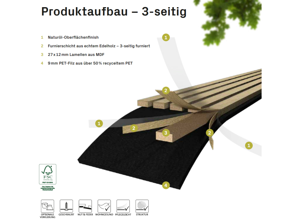 Die Paneele bestehen aus einer schwarzen Filz-Trägerplatte, auf der Lamellen aus MDF mit Echtholzfurnier angebracht sind. Diese besondere Struktur ermöglicht eine optimale akustische Regulierung und Nachhalldämpfung. Der PET-Filz ist zu über 50 % recycelt. Die Oberfläche der Paneele ist mit umweltfreundlichem Naturöl behandelt – für ein ansprechendes Finish bei gleichzeitigem Schutz vor Nachdunkeln und Vergilbung.