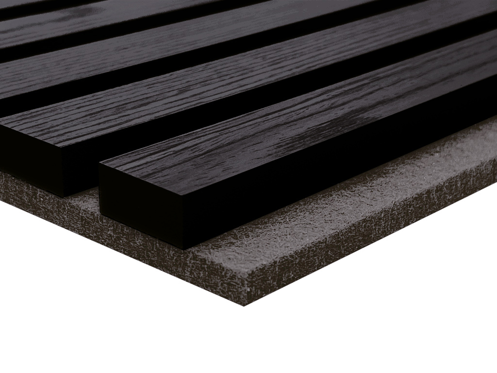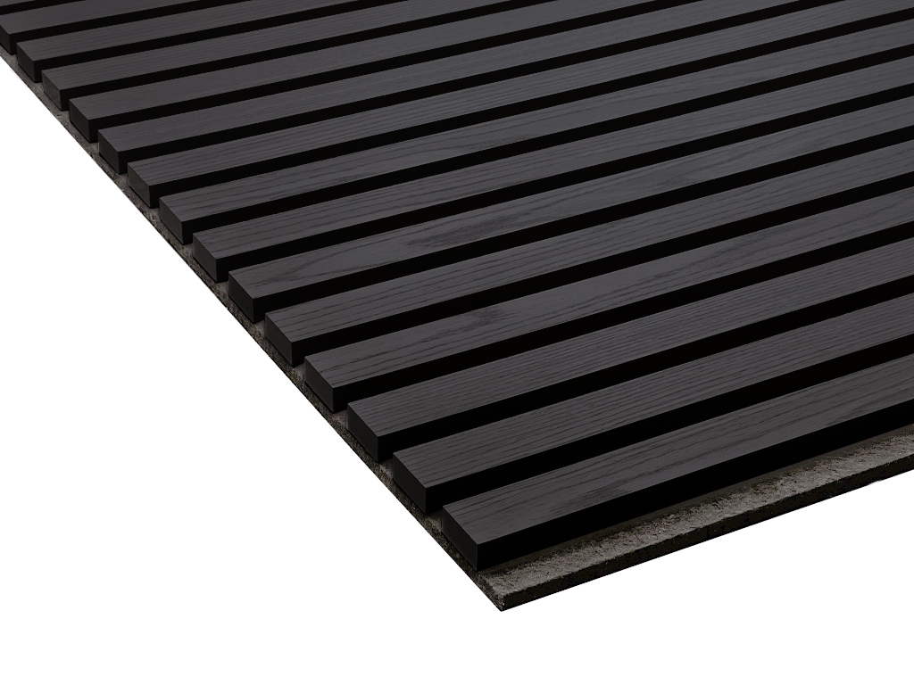 Akustikpaneele dienen der Gestaltung von Wänden und Decken. Zusätzlich stehen die akustischen Eigenschaften der Produkte im Vordergrund. Die Paneele haben eine graue Trägerplatte aus recyceltem, schallabsorbierenden Polyester, auf denen Lamellen (MDF) angebracht sind, die mit astfreier Eiche furniert sind.