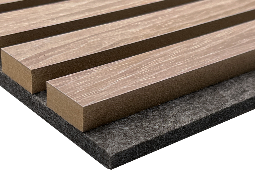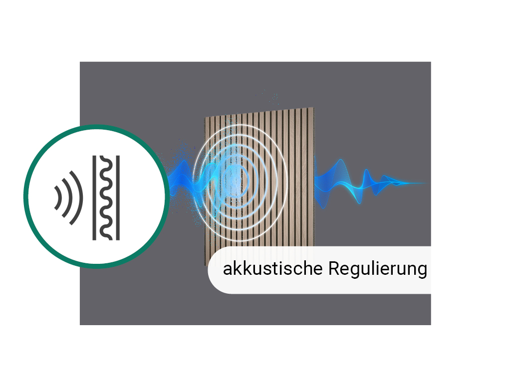Akustikpaneele dienen der Gestaltung von Wänden und Decken. Zusätzlich stehen die akustischen Eigenschaften der Produkte im Vordergrund. Die Paneele haben eine graue Trägerplatte aus recyceltem, schallabsorbierenden Polyester, auf denen Lamellen (MDF) angebracht sind, die mit astfreier Eiche furniert sind.