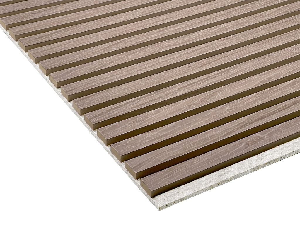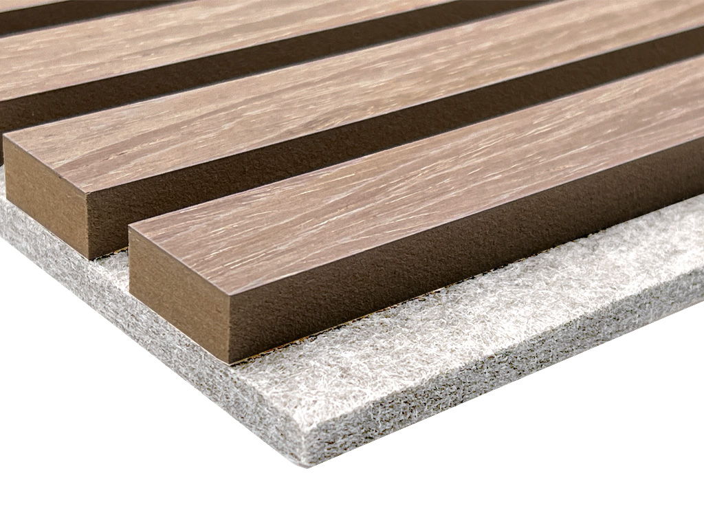 Akustikpaneele dienen der Gestaltung von Wänden und Decken. Zusätzlich stehen die akustischen Eigenschaften der Produkte im Vordergrund. Die Paneele haben eine hellgraue Trägerplatte aus recyceltem, schallabsorbierenden Polyester, auf denen Lamellen (MDF) angebracht sind, die mit astfreier Eiche furniert sind.