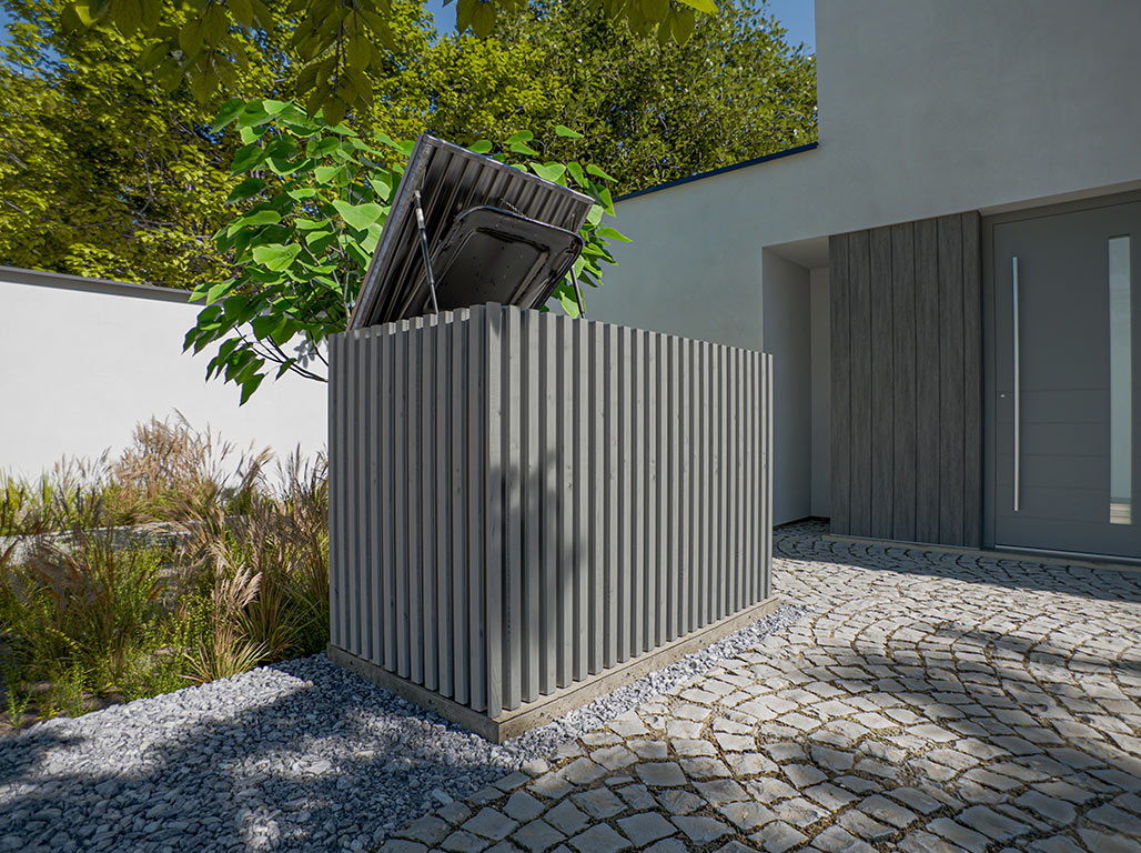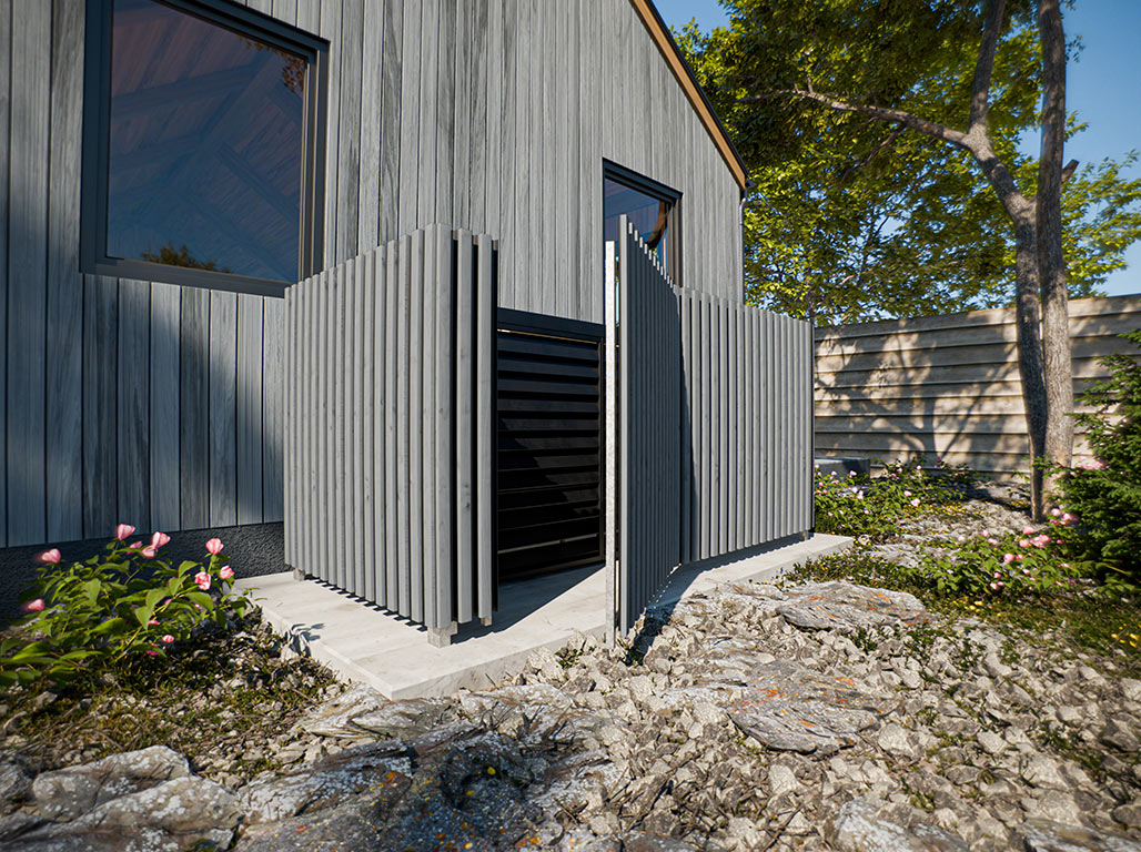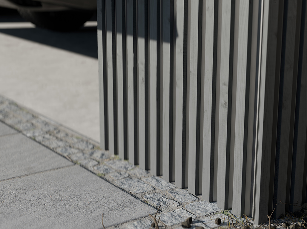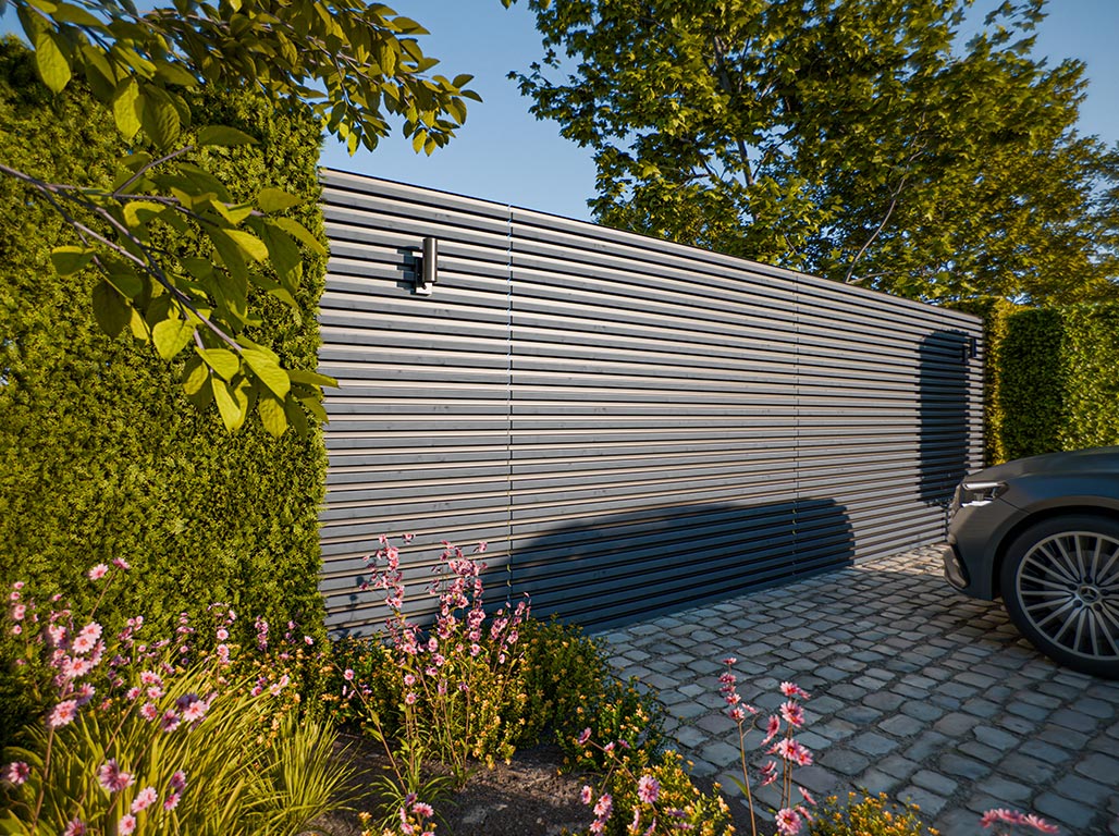 Aufgrund ihrer thermischen Behandlung benötigen die AluHolz-Paneele keine zusätzliche Pflege. Um ein allmähliches Vergrauen zu verhindern, kannst du einmal jährlich ein wasserbasiertes Öl auftragen. So erhältst du das Aussehen über Jahre hinweg.
