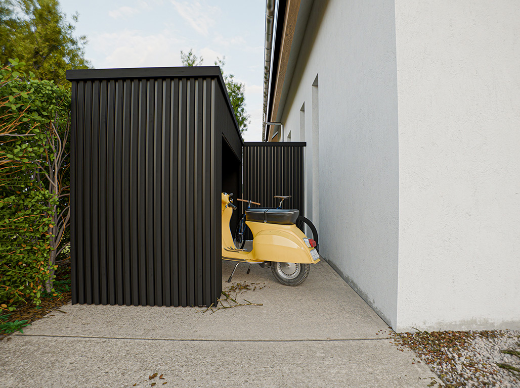Aufgrund ihrer thermischen Behandlung benötigen die AluHolz-Paneele keine zusätzliche Pflege. Um ein allmähliches Vergrauen zu verhindern, kannst du einmal jährlich ein wasserbasiertes Öl auftragen. So erhältst du das Aussehen über Jahre hinweg.