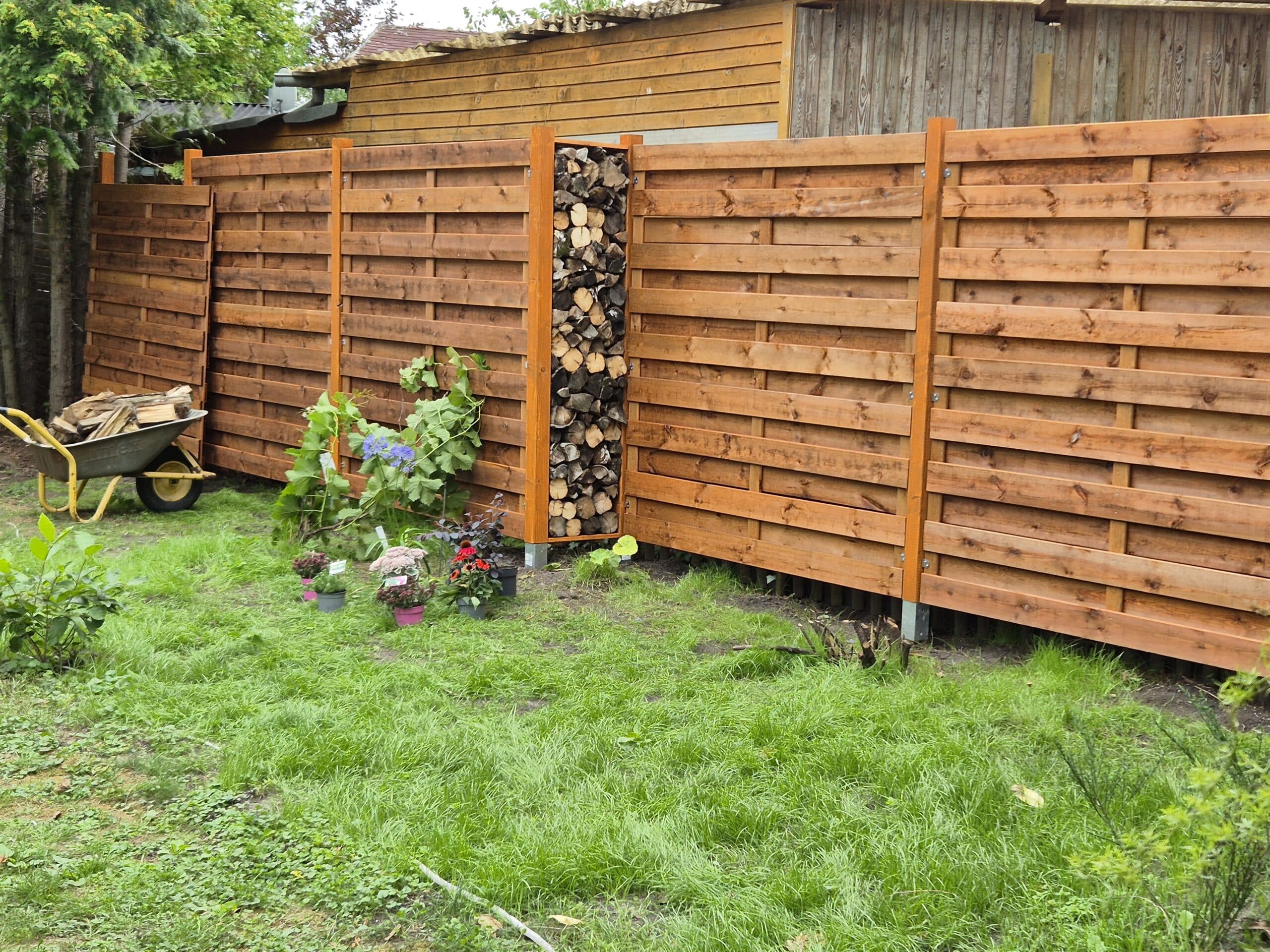 Die Holzlatten haben eine Stärke von ca. 12,5-13 x 120 mm und eine Gesamtstärke von ca. 4,5 cm. Der Zaun kann in der Breite beliebig gekürzt werden. Aufgebaut hat der Zaun eine Gesamtgröße von 180 x 180 cm.
