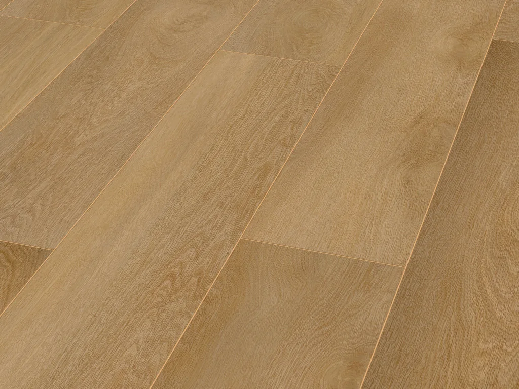 Das Dekor in authentischer Eichenholzoptik vermittelt fühlbare Wärme und Behaglichkeit. Landhausdielen besitzen mit ihrer Ein-Stab-Optik einen natürlichen und rustikalen Look, der jeden Raum gemütlich wirken lässt. Die 4-seitig umlaufende V-Fuge der Diele betont den rustikalen Charakter.