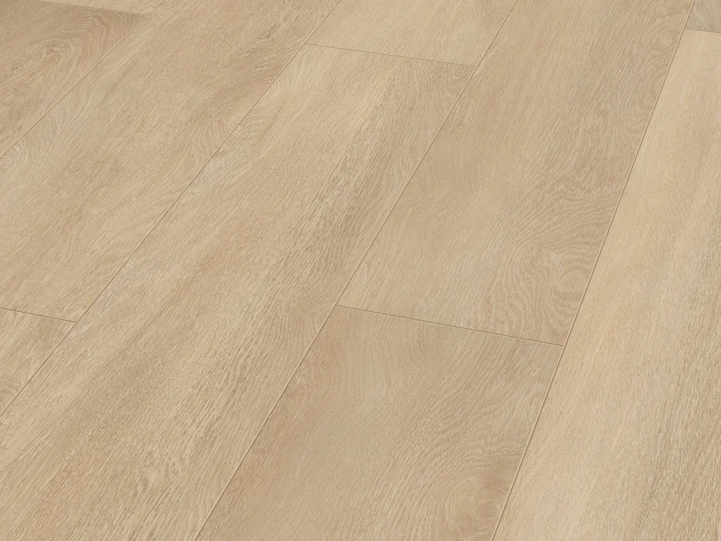 Die markante Eichenholzmaserung des Dekors vermittelt Behaglichkeit und natürliche Lebendigkeit. Der Landhausdielenlook bringt mit seinem natürlich wirkenden 1-Stab-Design südliches Flair in dein Zuhause und schafft eine Atmosphäre voller Ruhe und Gemütlichkeit. Die an vier Seiten umlaufende Fase strukturiert das Verlegebild und verleiht ihm ein gleichmäßiges Muster.