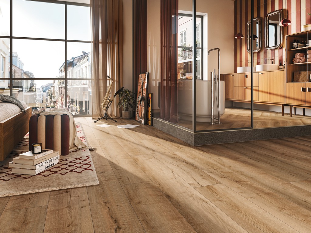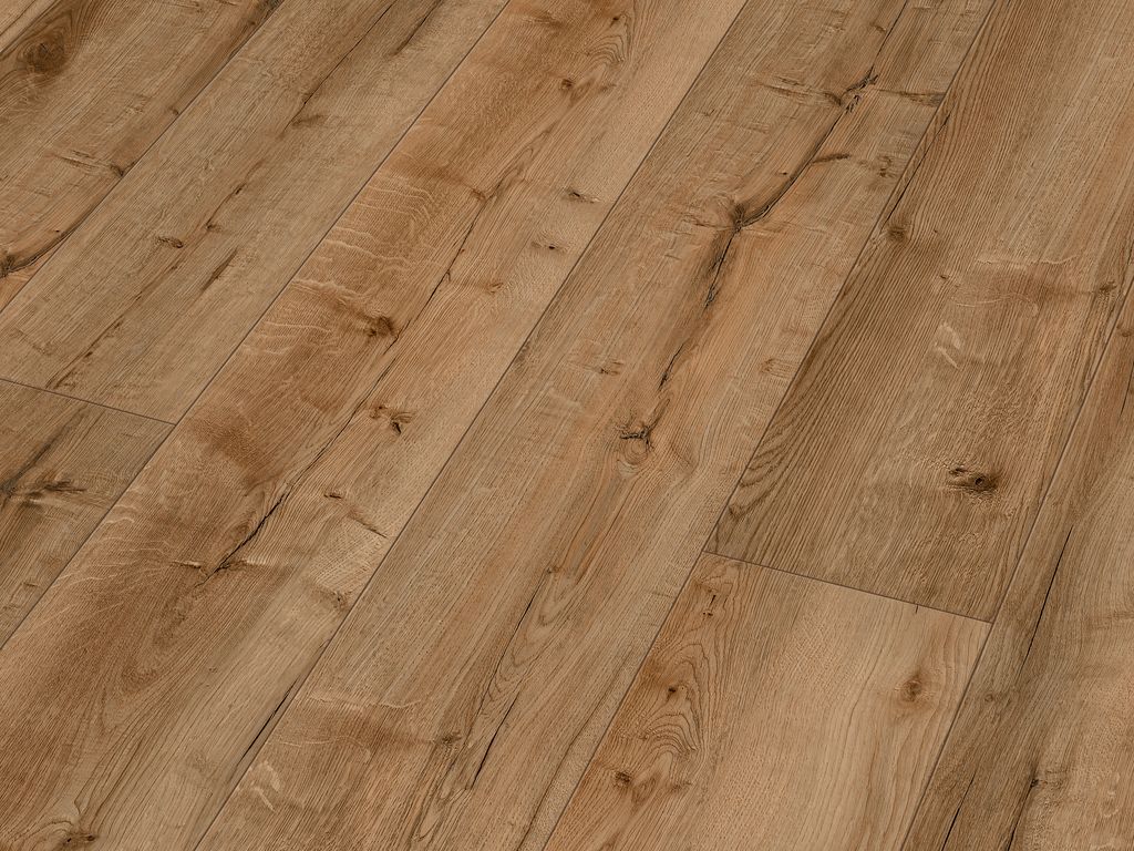 Das Dekor in edler Eichenholzoptik passt perfekt zu nahezu allen aktuellen Einrichtungsstilen. Der Landhausdielenlook bringt mit seinem natürlich wirkenden 1-Stab-Design südliches Flair in dein Zuhause und schafft eine Atmosphäre voller Ruhe und Gemütlichkeit. Die 4-seitig umlaufende V-Fuge verstärkt den Charakter der Diele und gibt ihr mehr Struktur. Dank der strukturierten Oberfläche entsteht optisch und fühlbar der Eindruck eines echten Holzbodens.