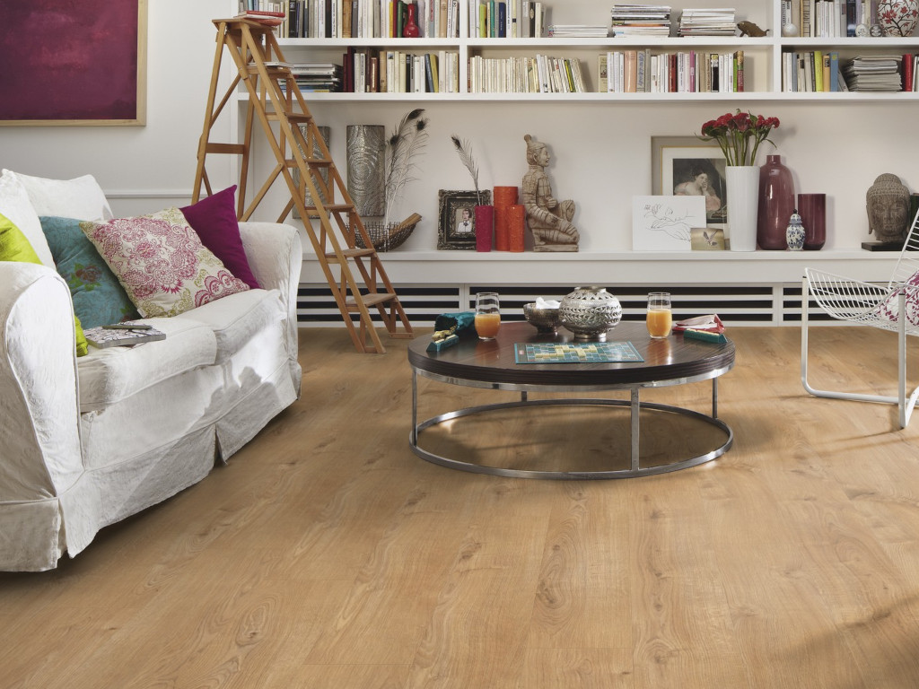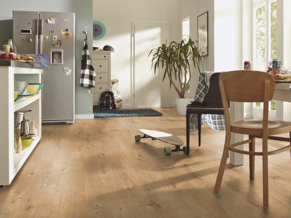 Durch seine wasserresistente Trägerplatte kann dieser Bodenbelag auch in Feuchträumen wie Küche oder Bad eingesetzt werden. Für den Einsatz über einer Warmwasserfußbodenheizung ist dieser Boden freigegeben.