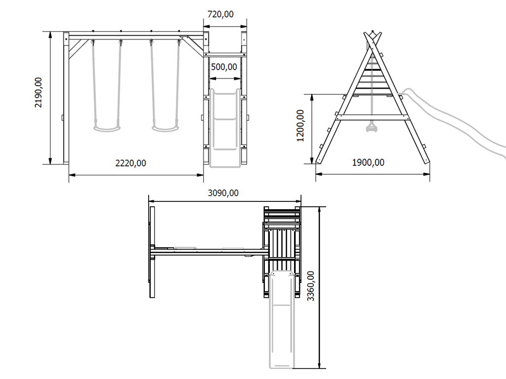 B x T x H: 309 x 189 x 219 cm, inkl. Podest-Anbau, inkl. 2,28 m Rutsche grün + Schaukelsitze grün