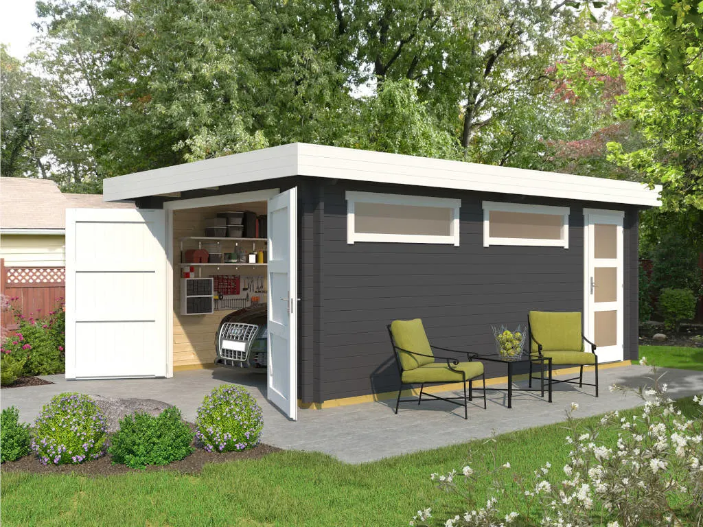 Lieferumfang Einzelgarage 441 graphitgrau, Holztor, 1 Zusatztür, 2 feststehende Fenster