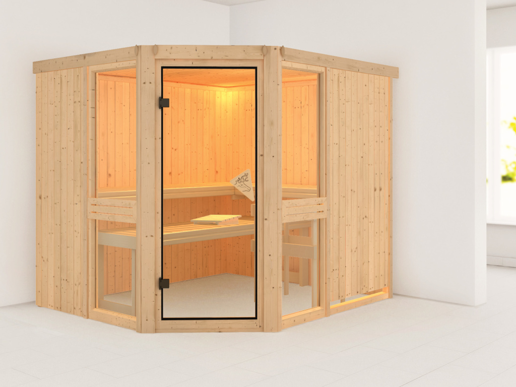 Eckeinstieg: Saunen dieser Form machen sich besonders gut in kleinen Räumen, da sie platzsparend sind, aber trotzdem viel Freiheit zum Saunieren bieten. Kompakt und in nahezu jeden Raum integrierbar!