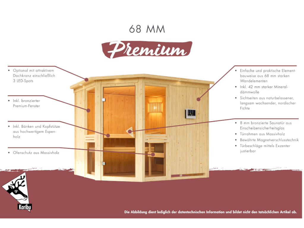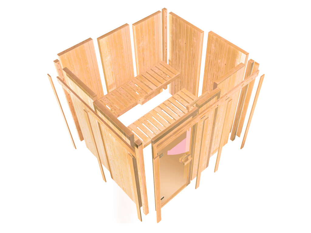 1x Ofenschutzgitter, 1x Kopfstütze, 2x Fenster, 3x Liegen, 1x Querliege, 9kW Bio-Kombiofen, externe Steuerung, Steine und inkl. Montageanleitung und Beschlägen