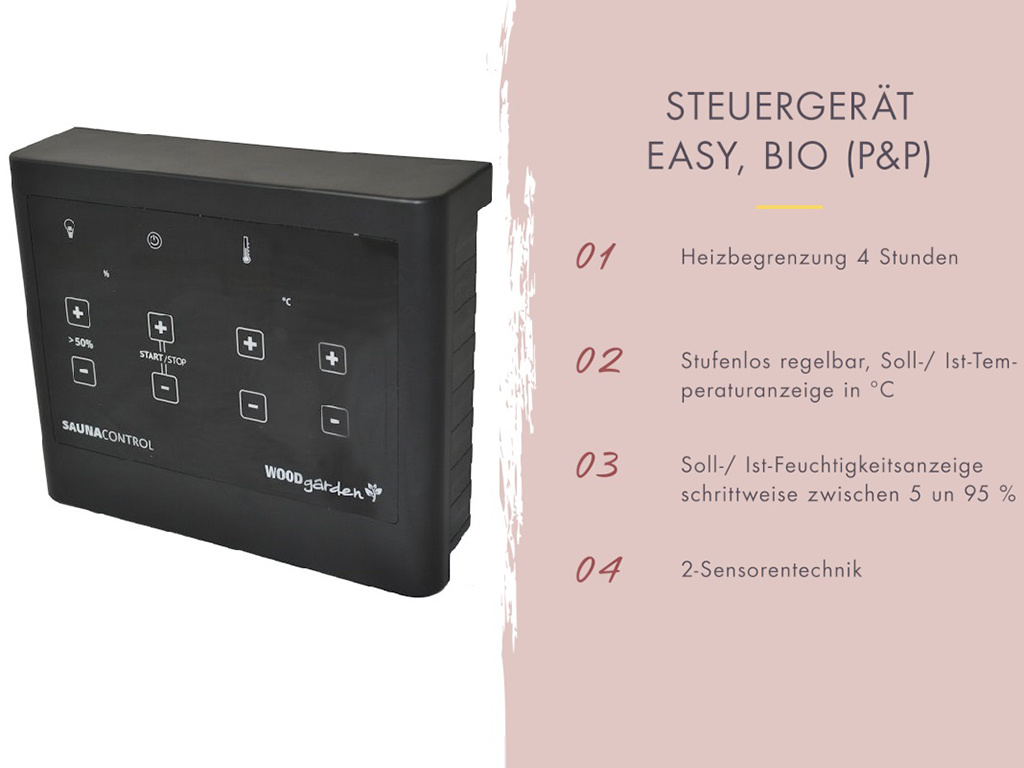 - Die Lieferung der Sauna erfolgt ohne Saunaofen und -steuerung. Diese können in unserem Onlineshop separat erworben werden. Falls du dich nicht für einen Ofen mit integrierter Steuerung entscheidest, kannst du eine externe Steuerung kaufen. Diese ist praktisch außerhalb der Sauna bedienbar und verfügt über vielseitige Einstellungsmöglichkeiten.
