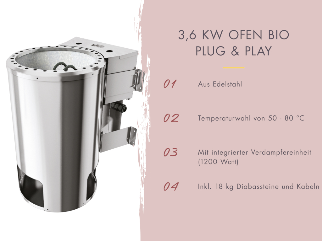 | Lieferumfang: | Sauna, 1 Liegebank inkl. Kopfstütze (Espe), inkl. 3,6 kW Bio-Ofen mit externer Steuerung, Saunasteine (18 KG) |