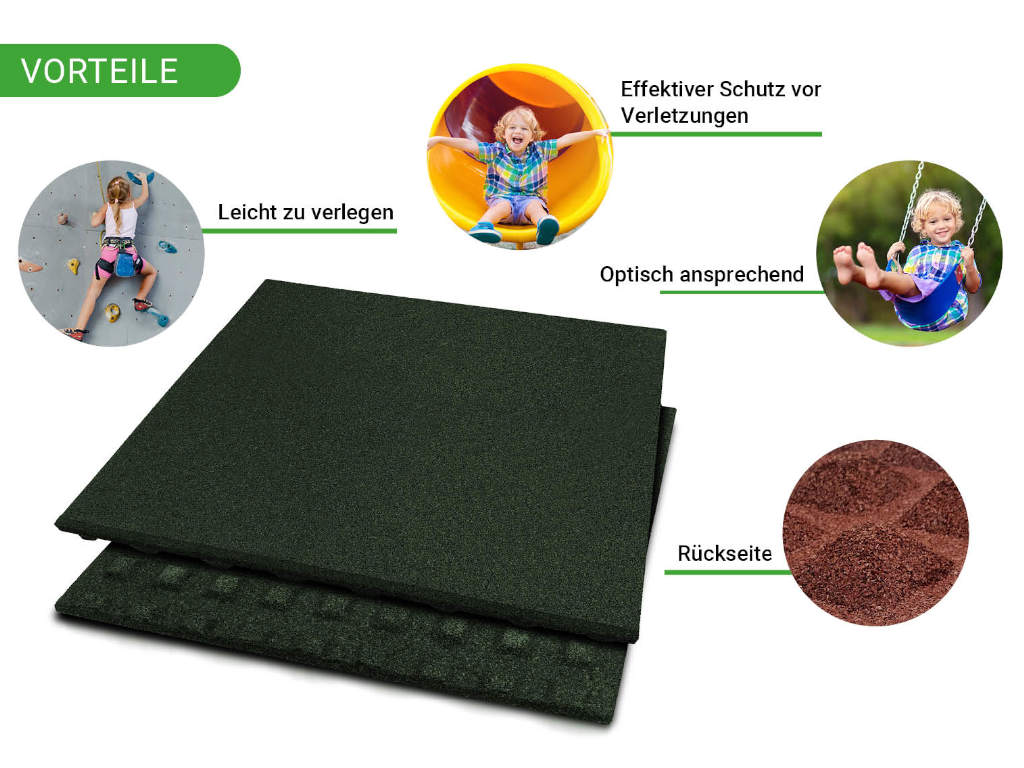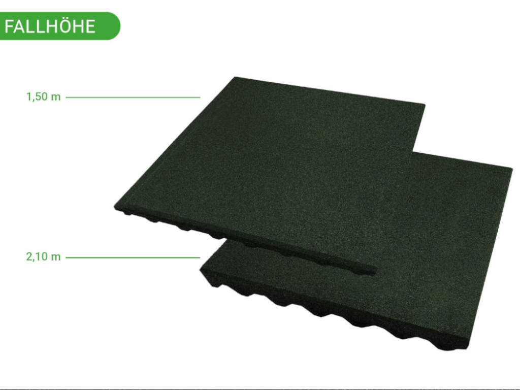 Diese Fallschutzmatten bestehen aus gepresstem Gummigranulat. Dadurch sind sie besonders stoßdämpfend und schalldämmend. Aufgrund der Materialeigenschaft sind sie garantiert bei jeder Witterung für den Außenbereich geeignet und auch bei Nässe rutschfest. Durch Drainagefugen an der Unterseite kann Wasser schnell von der Oberfläche ablaufen.