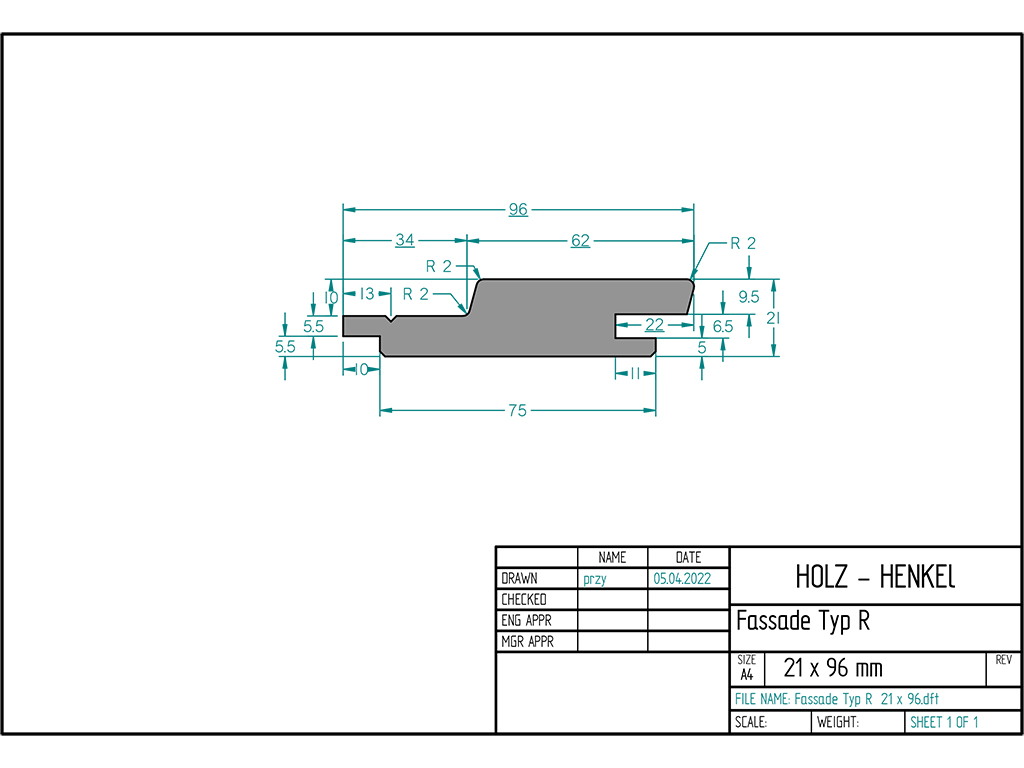 - Maße: 9,6 cm breit, 21 mm stark, mit Nut und schwarzer Feder, in verschiedenen Längen erhältlich