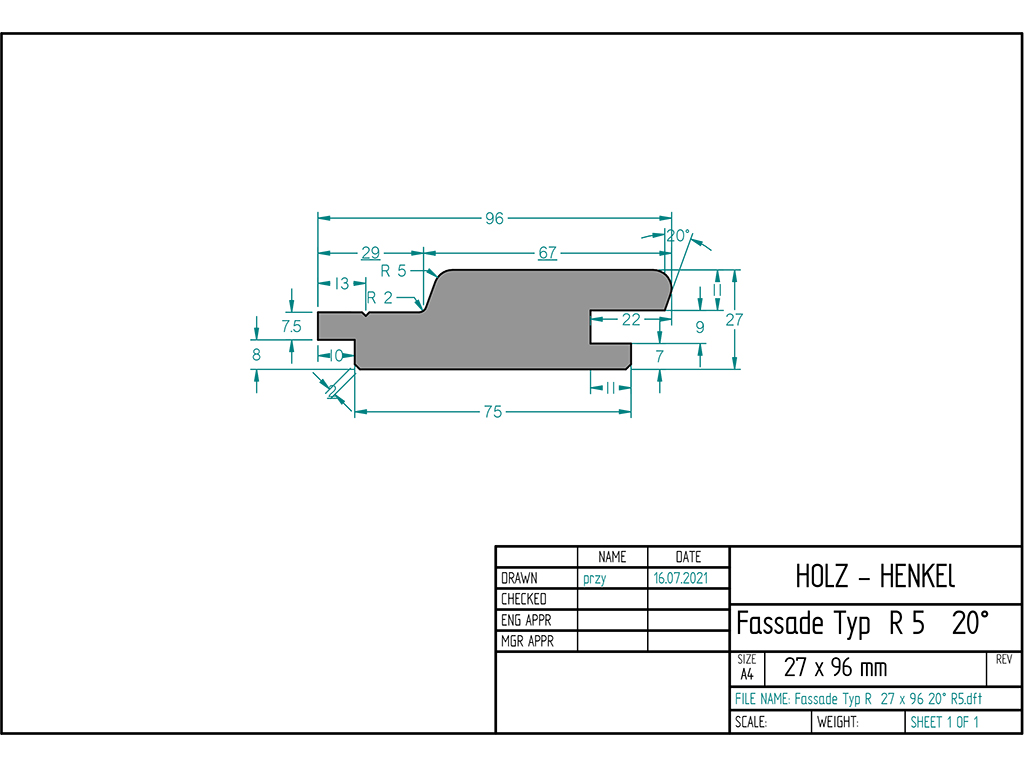 - Maße: 9,6 cm breit, 27 mm stark, mit Nut und schwarzer Feder, in verschiedenen Längen erhältlich