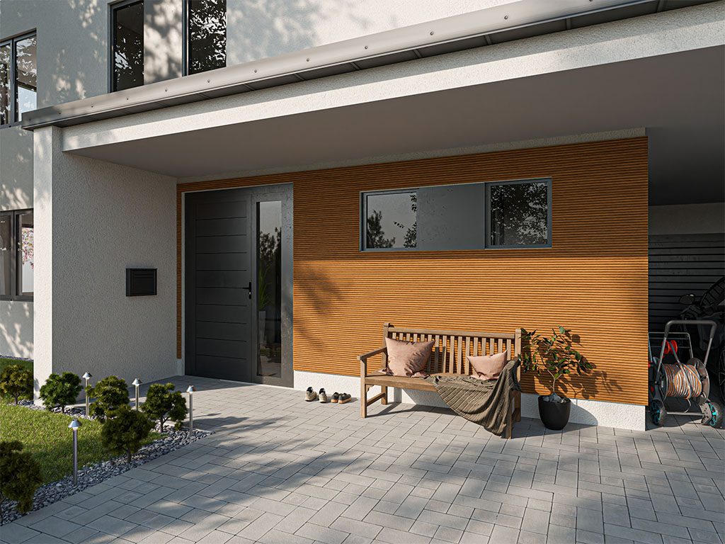 Die Paneele sind mit UV-Lackierung beschichtet und können im Außenbereich verwendet werden, wenn sie wettergeschützt angebracht werden.