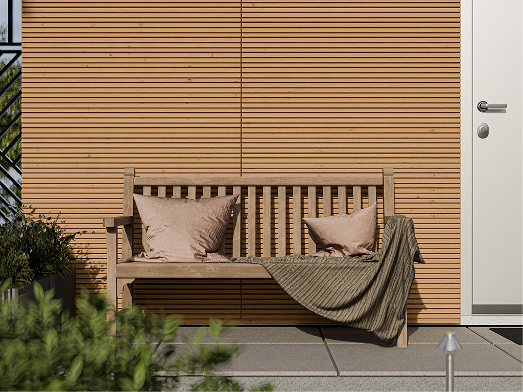 Die Thermokiefer eignet sich aufgrund ihrer enormen Haltbarkeit hervorragend für die Anwendung im Außenbereich und durch die Rhombusleiste wird eine gute Wasserableitung an deiner Fassade gewährleistet.