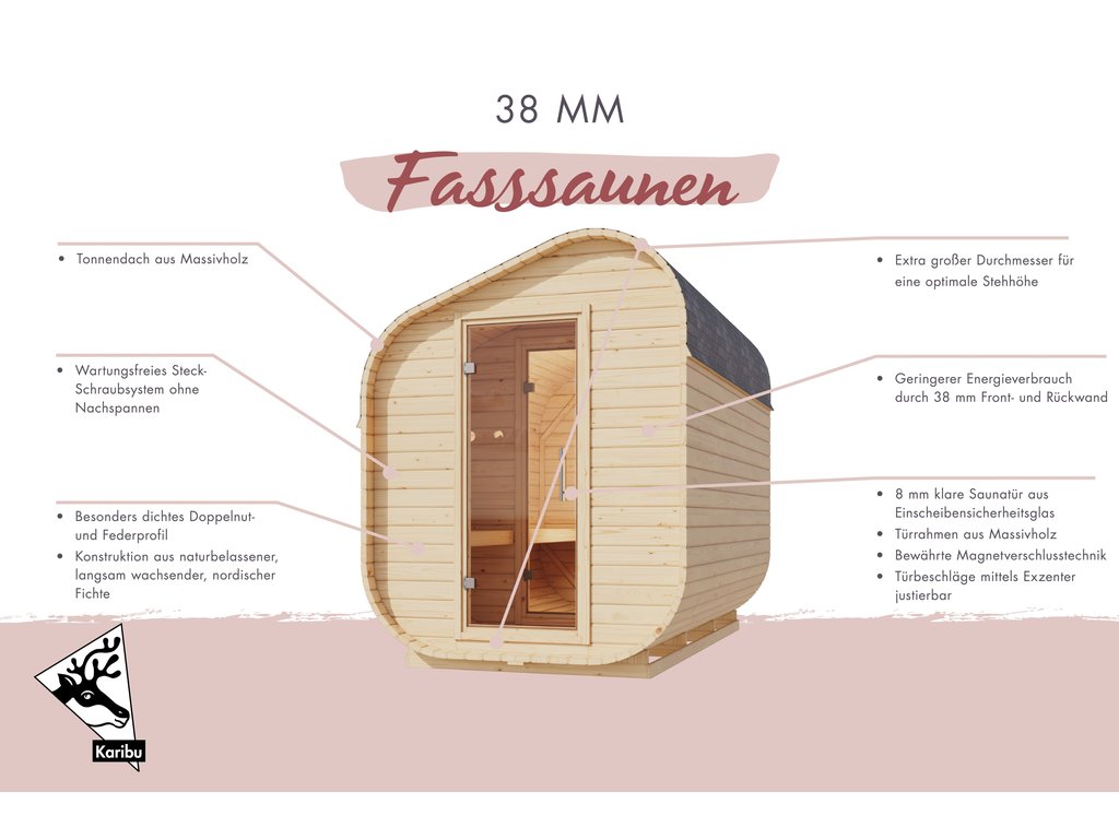 KARIBU Fasssauna asymmetrisch 1 38 mm naturbelassen mit 9 KW Ofen und ext. Steuerung
