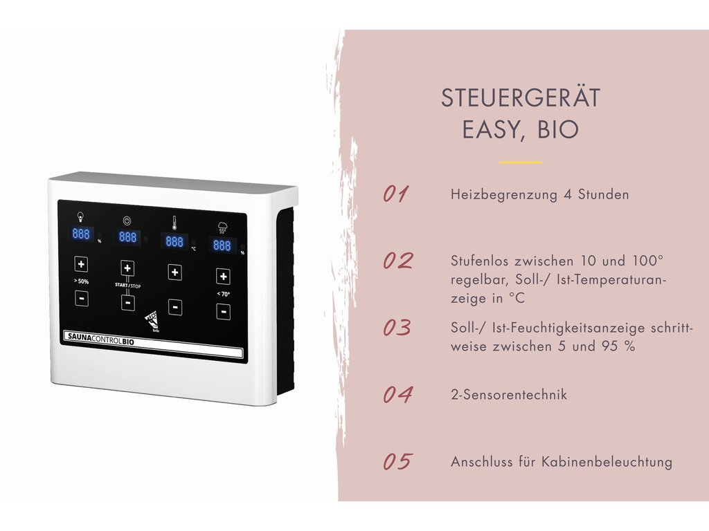 • Die Lieferung der Sauna erfolgt ohne Saunaofen und -steuerung. Diese können in unserem Onlineshop separat erworben werden. Falls du dich nicht für einen Ofen mit integrierter Steuerung entscheidest, kannst du eine externe Steuerung kaufen. Diese ist praktisch außerhalb der Sauna bedienbar und verfügt über vielseitige Einstellungsmöglichkeiten.