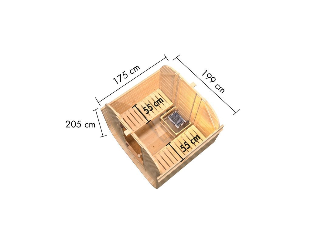 Fasssaunen ziehen mit ihrer außergewöhnlichen Optik nicht nur alle Blicke auf sich, sondern bieten auch hervorragende technische Eigenschaften. Die runde Form ermöglicht eine optimale Luft- und Wärmezirkulation sowie ein besonders schnelles, sparsames Erhitzen ohne unangenehmen Hitzestau in den Ecken und unter der Decke. Dank ihrer kompakten Form und geringen Grundfläche sind Fasssaunen besonders gut für kleine Gärten geeignet. In dieser Sauna können 2-4 Personen gleichzeitig saunieren.
