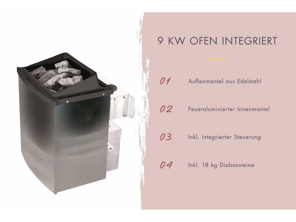 • Bitte beachten: Im Lieferumfang dieser Sauna ist KEIN Saunaofen enthalten. Von dieser Sauna sind jedoch Varianten inkl. Saunaofen erhältlich (siehe oberhalb des Warenkorb-Buttons). Zusätzlich findest du im Onlineshop eine große Auswahl an verschiedenen Öfen.