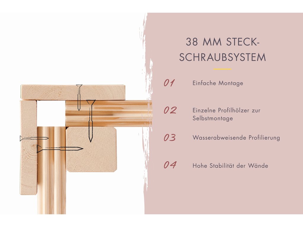 Dieses Saunamodell – eine System- bzw. Elementsauna – zeichnet sich durch seine besondere Sandwich-Bauweise aus, d. h., die Wandelemente bestehen aus einzelnen Schichten. Die bereits vorgefertigten Wandelemente aus Fichte ermöglichen einen schnellen Aufbau innerhalb weniger Stunden. Mit einer Wandstärke von 38 mm sind Systemsaunen optimal isoliert und somit besonders energiesparend. Wegen der sehr gut gedämmten Elemente heizt sich die Systemsauna extra schnell auf.
