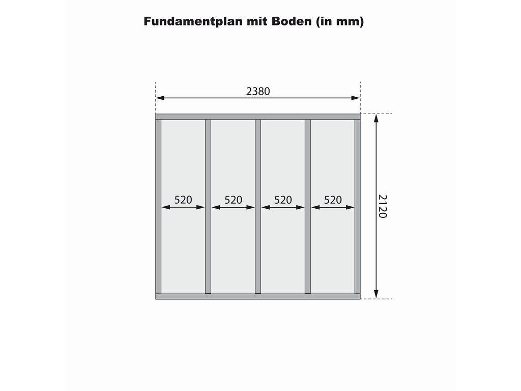 Orientiere dich für die Erstellung des Fundaments am Grundriss bzw. an der mitgelieferten Montageanleitung! Produktblätter, Montageanleitungen und weitere wichtige Hinweise findest du unter der Produkttabelle.