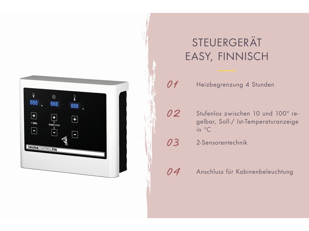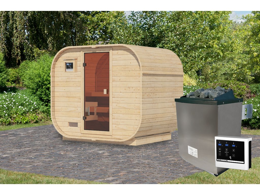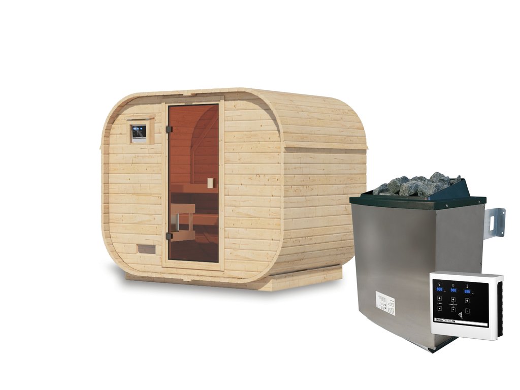 - Die Lieferung der Sauna erfolgt ohne Saunaofen und -steuerung. Diese können in unserem Onlineshop separat erworben werden. Falls du dich nicht für einen Ofen mit integrierter Steuerung entscheidest, kannst du eine externe Steuerung kaufen. Diese ist praktisch außerhalb der Sauna bedienbar und verfügt über vielseitige Einstellungsmöglichkeiten.