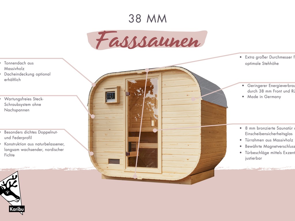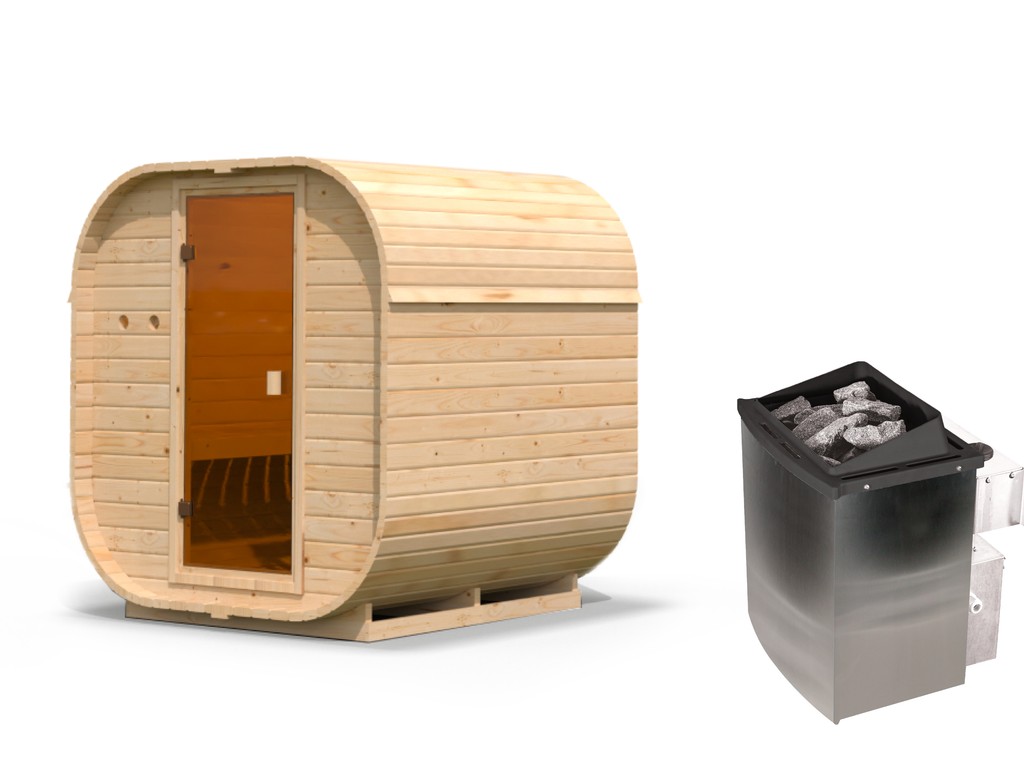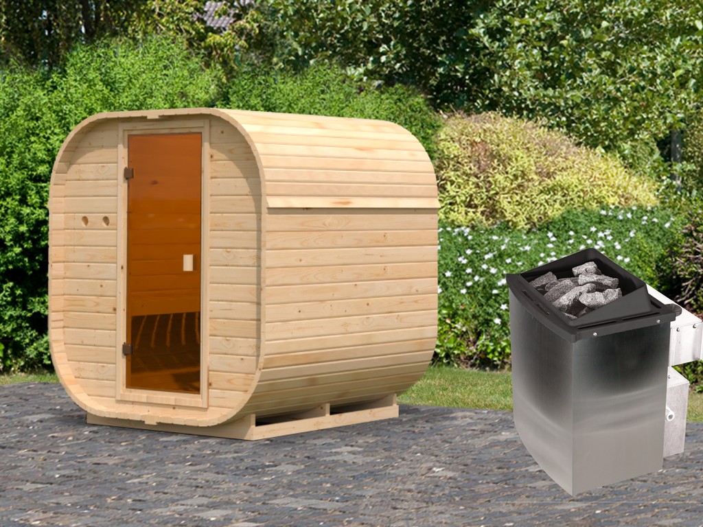 Fasssaunen ziehen mit ihrer außergewöhnlichen Optik nicht nur alle Blicke auf sich, sondern bieten auch hervorragende technische Eigenschaften. Die runde Form ermöglicht eine optimale Luft- und Wärmezirkulation sowie ein besonders schnelles, sparsames Erhitzen ohne unangenehmen Hitzestau in den Ecken und unter der Decke. Dank ihrer kompakten Form und geringen Grundfläche sind Fasssaunen besonders gut für kleine Gärten geeignet. In diesem Modell können 2-3 Personen gleichzeitig saunieren.