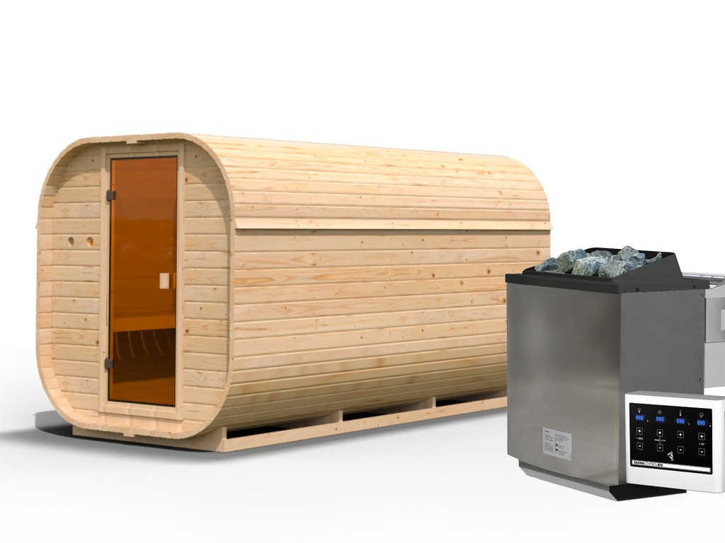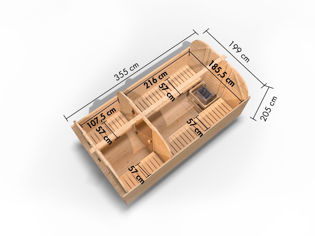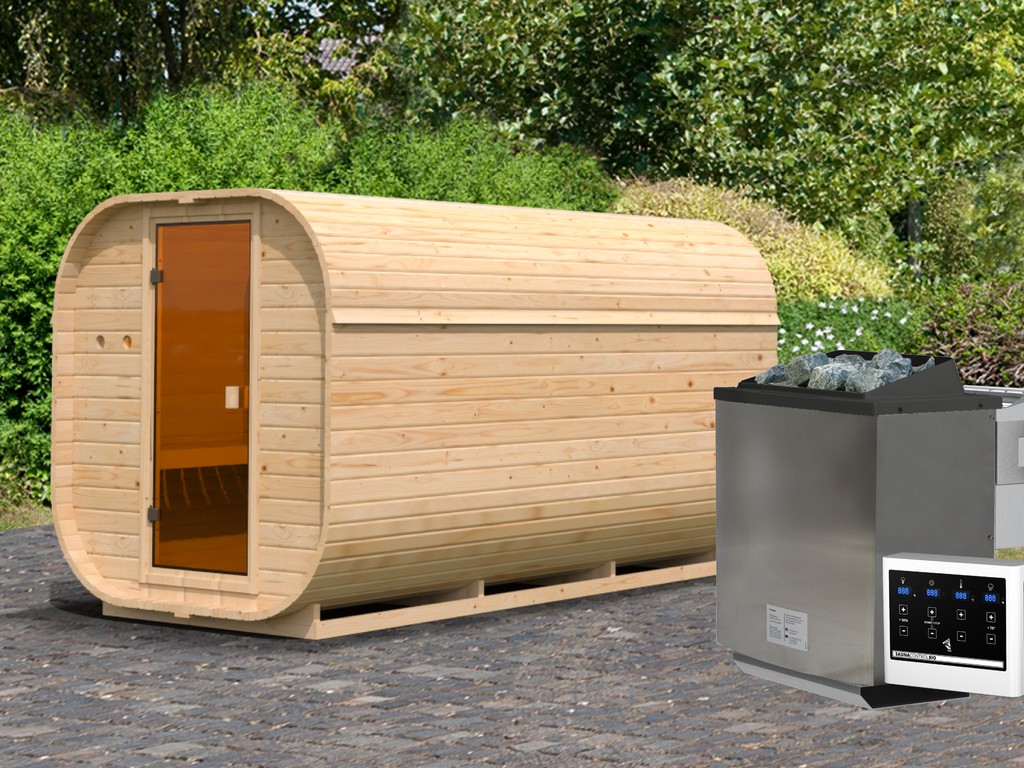 Fasssaunen ziehen mit ihrer außergewöhnlichen Optik nicht nur alle Blicke auf sich, sondern bieten auch hervorragende technische Eigenschaften. Die runde Form ermöglicht eine optimale Luft- und Wärmezirkulation sowie ein besonders schnelles, sparsames Erhitzen ohne unangenehmen Hitzestau in den Ecken und unter der Decke. Dank ihrer kompakten Form und geringen Grundfläche sind Fasssaunen besonders gut für kleine Gärten geeignet. In diesem Modell können 4-5 Personen gleichzeitig saunieren.