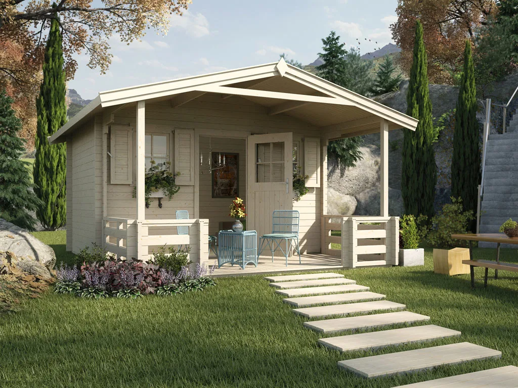 Die Wandstärke von 45 mm sorgt für gute Stabilität und Langlebigkeit. Dank der Bohlenstärke ist das Gartenhaus im Winter frostsicher, und im Sommer hat es gute wärmeisolierende Eigenschaften, was es zu einem perfekten Übernachtungsort für Gäste macht. Auch Pflanzen können in diesem Gartenhaus problemlos überwintern.