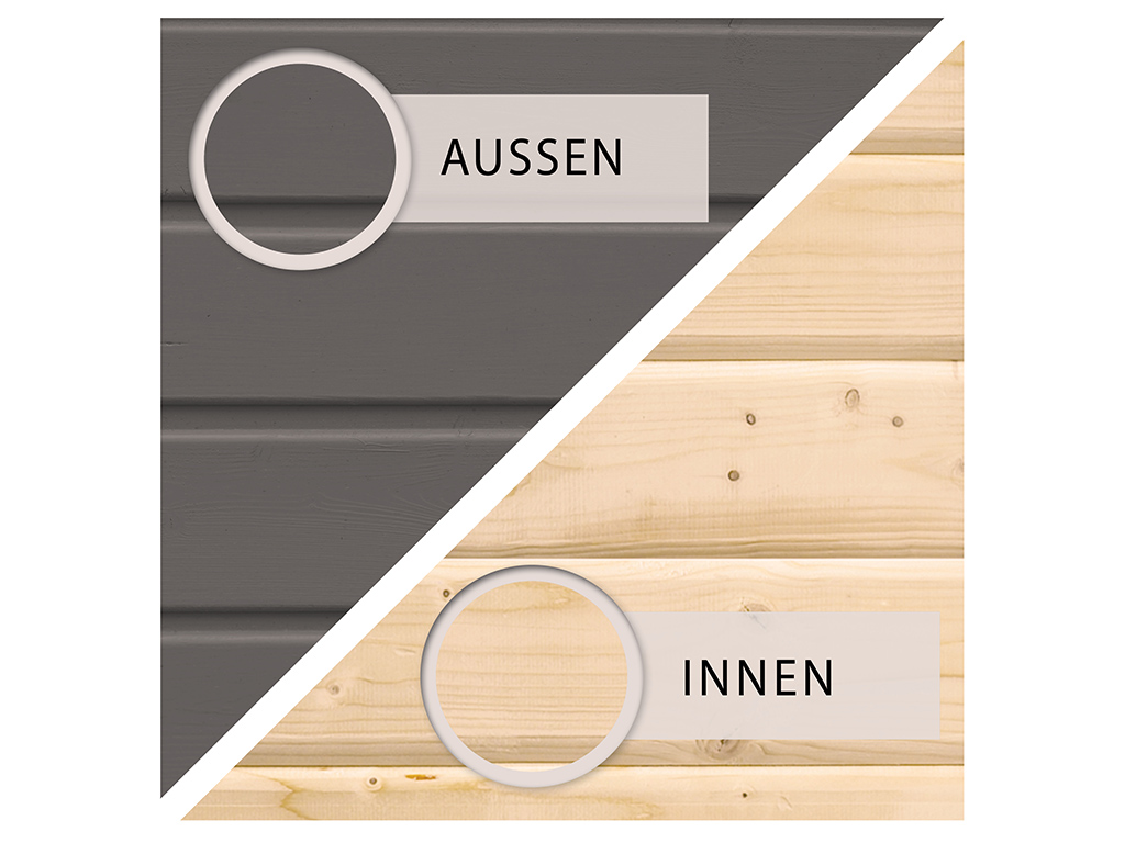 Die Kombination aus Holzlack und Holzlasur bei diesem Gartenhaus sorgt für optimalen Schutz gegen Witterungseinflüsse, Schädlinge und Schimmel und wertet das Haus optisch auf. So wird die Langlebigkeit des Holzes deutlich erhöht und die Freude am Gartenhaus verlängert.