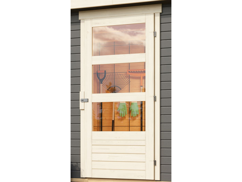 • In der Lieferung ist eine Massivholz-Einzeltür mit Lichtausschnitt, Sicherheitsüberwurf mit Drehöse (Kunstglas) enthalten.