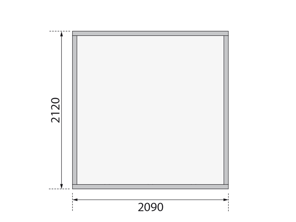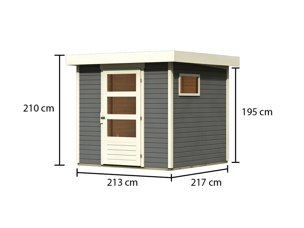 Der Sockelmaß vom Gartenhaus beträgt 209 x 213 cm (B x T). Eine optimale Raumnutzung wird dank einer Firsthöhe von 210 cm gewährt.